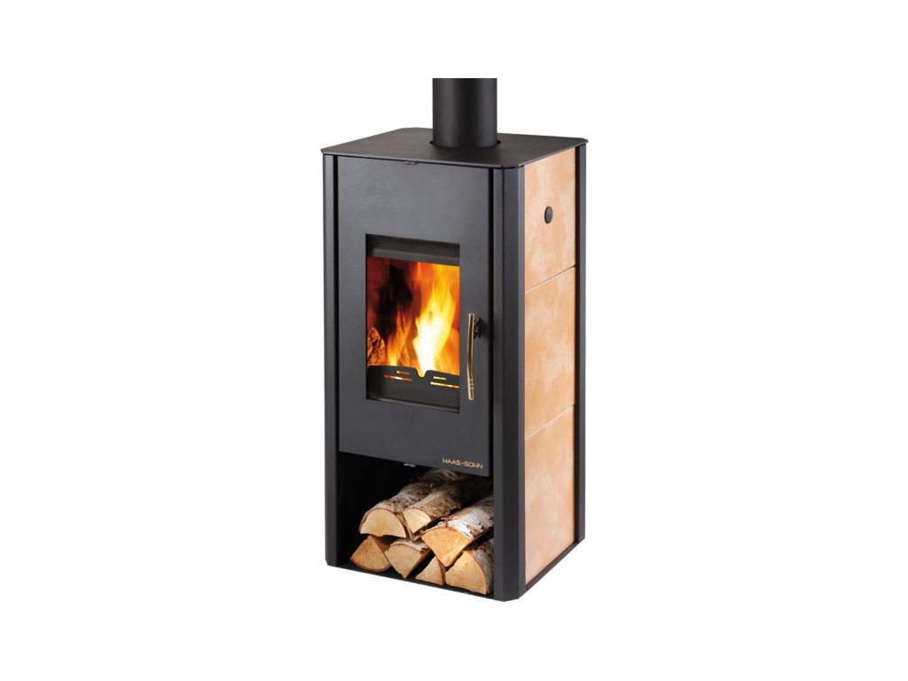 Wąski kwadratowy wkład kominkowy w kolorze czarnym z beżowymi kaflami i wymiennikiem ciepła, HAAS+SOHN, MANTOVA II ALParametry dodatkowe